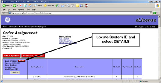 - From the eLicense homepage, enter the system ID or host ID and modality in the System Configuration section, and click Go (the System Information screen, shown below, lists all the options generated for that system. Other information listed: Generate Date, Order ID, License information and the SSO of the user who generated the option keys).