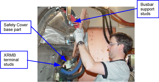 - Align the six busbar lugs with the XRMB coil terminal studs, and smoothly push the lugs onto the terminal studs. Meanwhile, slide the busbar assembly onto the four busbar support studs Figure 9.