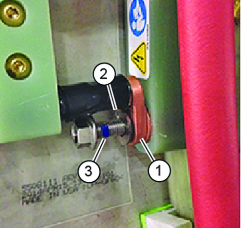 Item Description 1 Bus bar terminal lug 2 Loctite on stud 3 Nord-Lock washer (installed after lug) - Hand-tighten the new stainless steel nut on the stud.