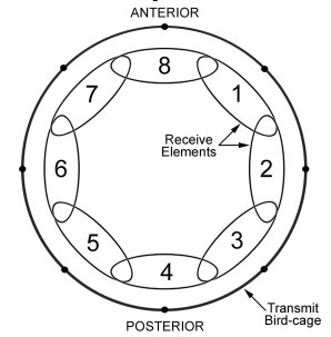 The 1.5T HD Knee Array consists of 8 receive elements, and a quad birdcage transmit coil. Each receive element is comprised of a loop arranged azimuthally around the knee. Each loop is approximately 45° in azimuthal extent. The center of Loop #1 is located 45° rotated in the clockwise direction (as viewed from the head) with respect to the center of the patella. Each of the next seven loops is rotated clockwise by 45° successively. During transmit, each receive loop is decoupled with both passive and active decoupling, with an additional active preamp protection network. During receive, the transmit bird-cage is decoupled and signals from elements 1 – 8 are directed to separate ultra-low-input impedance preamp modules placed directly at the output of the loop. These preamp modules provide additional element decoupling. In addition, the 1.5T HD Knee Array allows receiving with the bird-cage coil to obtain a uniform signal from the imaging volume.