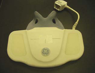 Carefully align the face component part of the coil with the connector pins over this posterior head face section and latch both the coil sections into place as shown in Figure 8. (The scanner will not operate if the coil sections are not latched correctly.)