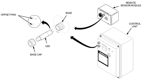 Align the offset pins of the new LED with the holes in the base on the Remote Sensor Module or Control Unit.
