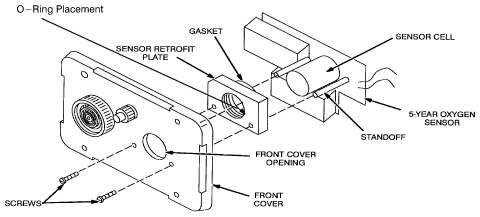 Remove the two screws securing the Sensor Retrofit Plate, Oxygen Sensor Cell, and Sensor Circuit Board to the front cover.