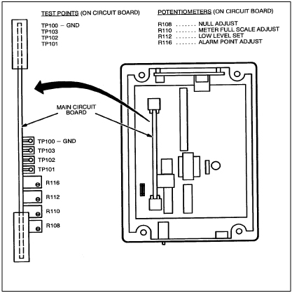 Adjust the Meter Full Scale Adjustment potentiometer R110 until the meter on the front cover of the Control Unit reads full scale (26%). Clockwise increases the meter reading, counterclockwise decreases the meter reading. See Figure 38.
