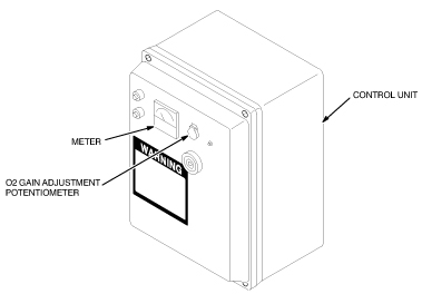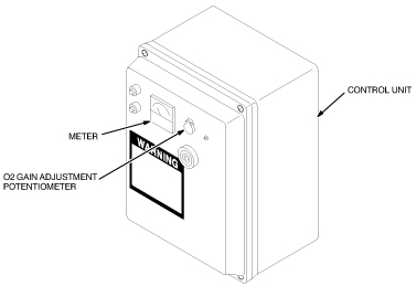Adjust the O2 GAIN adjustment potentiometer on the front cover of the Control Unit until the voltmeter reads 1.55 VDC. See Figure 33.