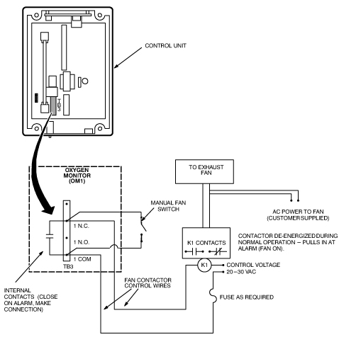 Two relays are available in the Control Unit which can be used to automatically activate customer-provided equipment, such as an exhaust fan, when the Oxygen Monitor subsystem enters an alarm state. The relay contacts are dry, with a rating of 2 amps continuous, 5 amps surge, at 120 VAC. One of the relays is a latching relay, the other is a non-latching relay.