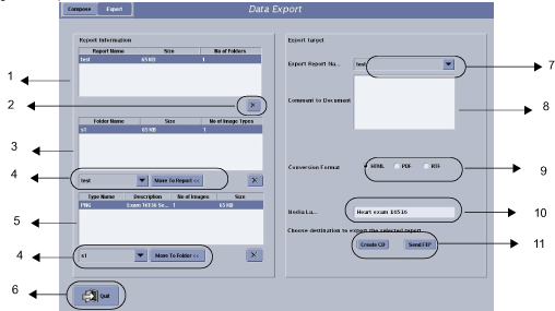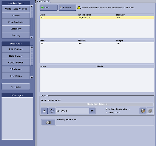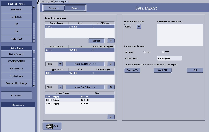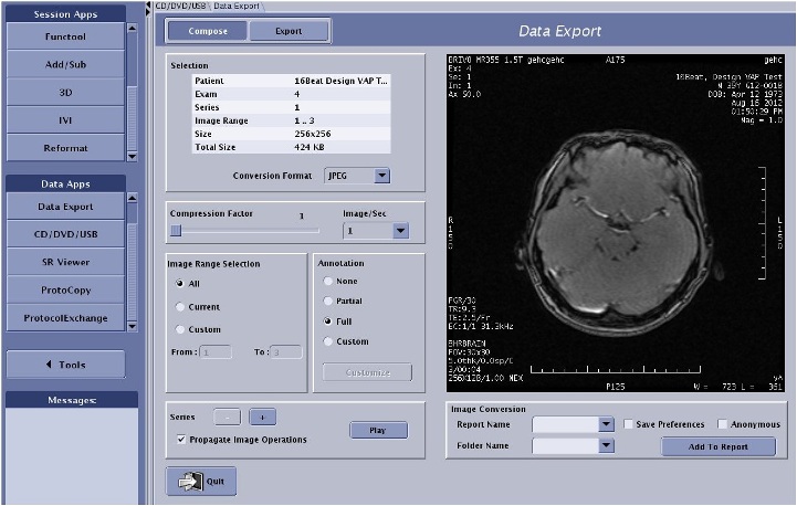 Data Export allows you to either store or ftp MR images as JPEG, PNG, AVI, MPEG or MOV formats. The files cannot only be burned to a CD-R but can be copied into a USB drive and only one report can be burned at a time. Once a CD-R has been burned, you cannot add more reports. In other words, it is a burn once process and not a re-writable process.