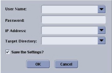 Enter information for all the fields. The User Name, Password, and IP Address are for the FTP destination site. Selecting Save the Settings only saves the Target Directory information. There must be a target directory at the IP address to successfully transfer files | |