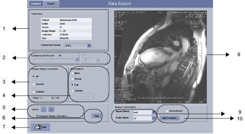 | 1 | Selection | Selection displays the Patient Name, Exam and Series number, the number of images in the series, the file size of the images with the current compression selection and matrix size. |