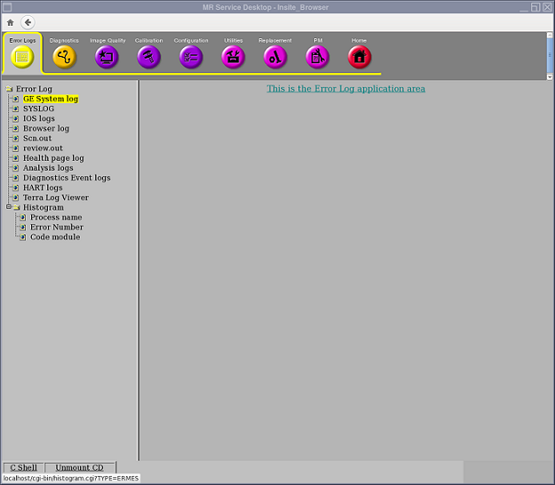 To open the GE System Log from the MR Service Desktop select .