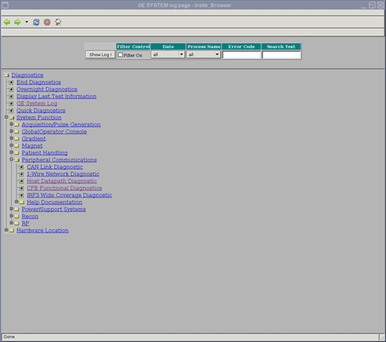 The Proprietary Error Log Viewer is used to provide an easy and efficient way for the field engineer, using either a Proprietary or Advanced Service Key to view the GE System Error Log. This advanced Error Log Viewer contains hyperlinks to extended error messages as well as the Diagnostic folder to run diagnostics associated with the error message.