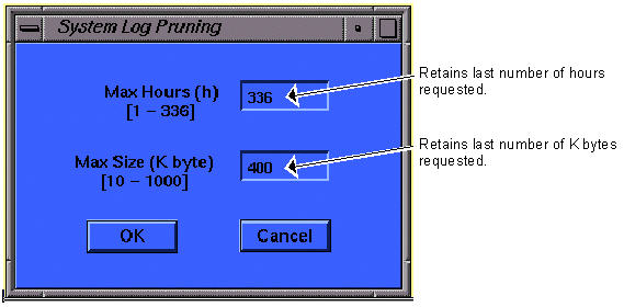 Note:Use both the hours and K byte to prune log. (e.g., if set to 24 hours and 50 k bytes but there are 100 K bytes of errors in last 24 hours, it will prune to 50 K bytes; this could cause only 1- 23 hours to be saved.)