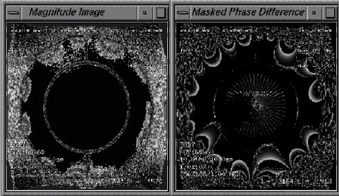 This option allows the display of each magnitude image and masked phase difference image in a separate window (shown in Figure 3) after the image data is processed. Both windows are updated when an alternate scan plane is selected. These windows will initially display in the upper right corner of the screen; reposition as necessary for viewing the LVShim Analysis window.