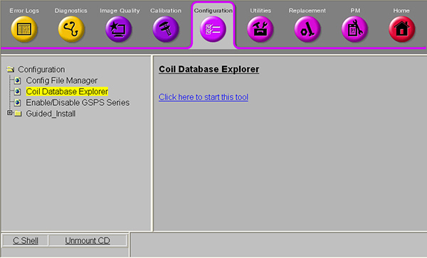 Click the Configuration tab on the Common Service Desktop, select Coil Database Explorer in the Configuration folder on the left, and Click here to start this tool to launch the Coil Database Explorer.
