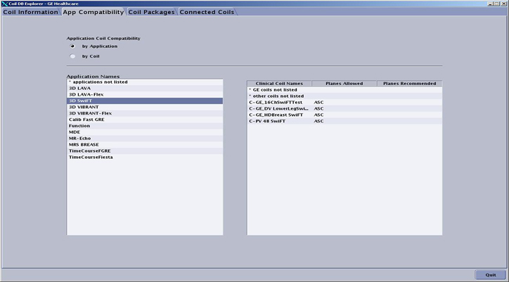 Click the App Compability tab to display the Clinical Coil Names associated with the various applications and vice versa as shown in the two examples below.