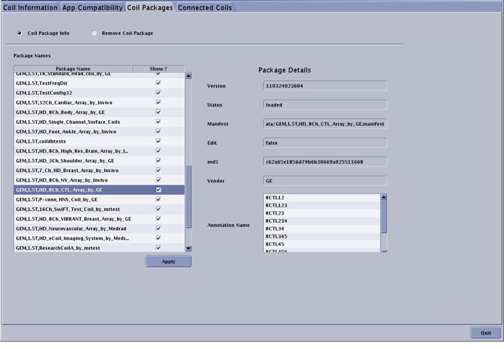 On the Coil Packages tab, select the Remove Coil Package radio button to display the list of non-GE supported coils loaded onto the system by the customer. To remove one of the coils listed, select the coil package in the list, click Remove and Quit.
