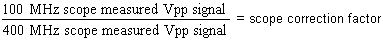 The scope correction factor for the scope channel in use must be known for oscilloscopes with a bandwidth < 300 MHz. One may assume that the correction factor is 1 (unity) for oscilloscopes with a bandwidth ≥ 300 MHz. Do not assume a correction factor for an input channel and do not assume that all the scope input channels have the same correction factor. Each channel must be characterized separately. There are three ways that this can be done.