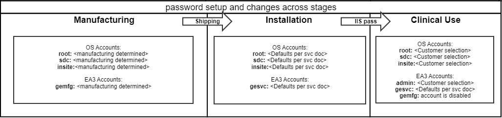The system install for MR can take anywhere from weeks to months. During this period GE owns the system until it is fully installed and handed over to the customer. During this install phase, most of the sites do not support InSite connectivity and hence backing up passwords in the back office is not possible. Since multiple FEs will most likely require access to the software on the system for various install actions, the SW has been designed to accept a temporary password until the completion of "install in spec". When the system is brought in spec, the software will force another change of passwords on all accounts so that the temporary passwords can be replaced with the customer passwords. From this point on, customers will need to manage their passwords on all of the user accounts on the system.