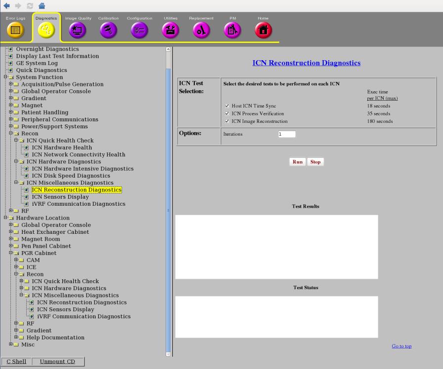 - Doing an Image Compute Node (ICN) image reconstruction test. This diagnostic tests the functionally of the ICN’s image reconstruction capabilities. Each ICN will have its components tested, memory, processors, software and others. This confirms each ICN is capable of performing image reconstruction.
