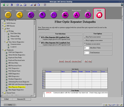| SRI Fiber Optic Repeater Loopback Test | This diagnostic tests the Scan Room Interface Serial Data path form the MGD Chassis to the Penetration Panel. Fiber Optic Repeater Board jumper must be in the “B” position. |