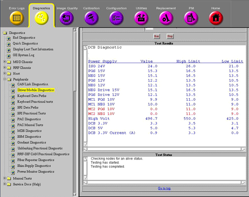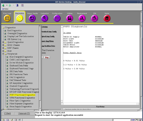 | IO Status | The test will check the status of the table DC Supply, Bore Light, Bore Vent, Alignment Light, Table Motor, Motor Amplifier, 8 volt supply, 3.3 volt supply, 5 volt supply. The Power Supplies will not come up as red for failures. |