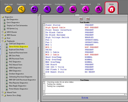 | RF Amp | Test time is ~6 seconds. This test verifies the operation of the MDS Link and the presence of the RFI and Analogic amplifiers. To verify the presence of these items, the Command Register is addressed and read by the SPI via the MDS. No additional tests are used. This test is only valid on systems that do not have an RFS Cabinet or Amplifier Support Controller. |