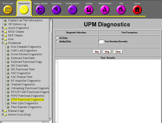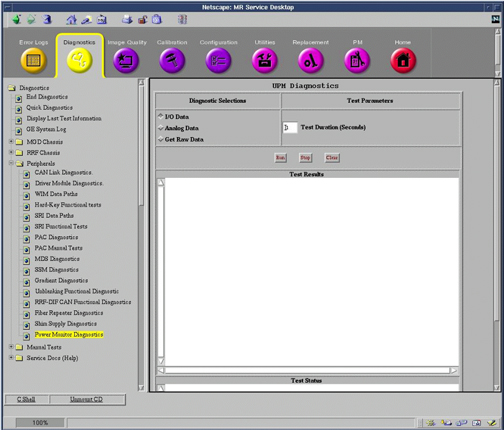 | Power Monitor | Test time is ~5 seconds. This test verifies the operation of the MDS Fiber Optic Link and the presence and operation of the CPD Board. To verify its presence, the Command Register of the CPD Board is read. To verify the functionality of the registers, a set of Multicoil Register tests are run simultaneously with patterns AA, 55, 33, 0F. Any errors are logged to indicate the failing register. This test is only valid on systems that do not have an RFS Cabinet or Amplifier Support Controller. |