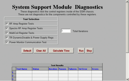 Test time is ~6 seconds. This test verifies the operation of the MDS Fiber Optic Link and the presence and operation of the Spectro RF Amplifier Interface register on the SSM CPD Board. The Command Register is addressed and read by the SPI on the SCP Board via the MDS. The functionality of the Spectro RF Amplifier register is confirmed by reading the register for a specific pattern. This test is only valid on systems that do not have an RFS Cabinet or Amplifier Support Controller. This test is present only on systems with the spectroscopy option. |