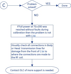 | 101419 | "RF Amplifier Excessive VSWR Fault." | Visually check all connections in Body or Head transmission lines for damage from the front of CSA to where the connections are made to the RF coil. Perform BODY AND HEAD MAXIMUM POWER RF OUTPUT CHECK. If all connections are good and the Maximum Power RF Output check is passed, and the problem persists, may need to replace CSA or contact OLC for support. |