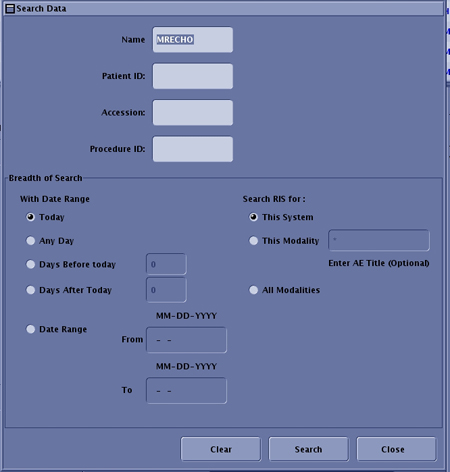 Enter a patient Name, Patient ID, Accession Number, or Procedure ID to define the search.