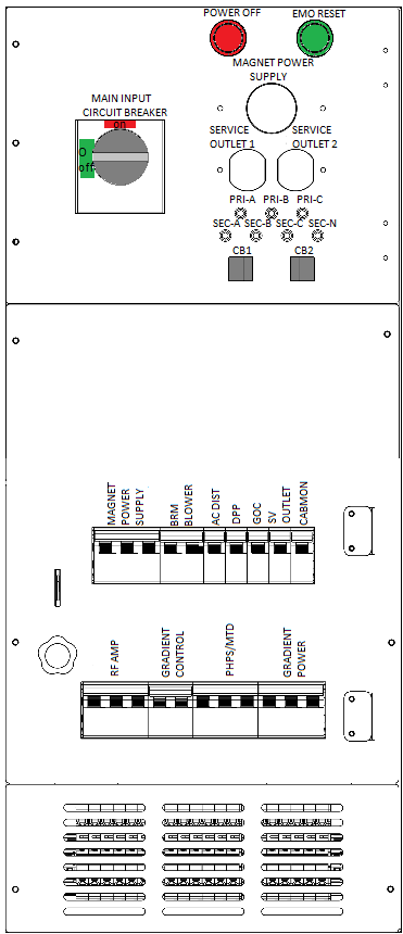 Rotate the larger main breaker labeled MAIN INPUT counter-clockwise to the green, OFF (O) position.