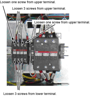 Loosen 3 screws and disconnect 3 cables from the upper contactor