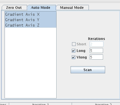3. Click on the Auto Mode tab. See Figure 4. All three-coil axes will be selected. Click the Scan button to start the calibration. (When the scan is active, you can stop it by pressing the Abort button and the “STOP” button on keyboard.)
