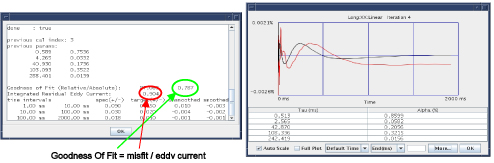 A Goodness of Fit parameter is calculated for each data curve. The parameter gives an indication of how well the best-fit curve matches the collected data curve. This parameter is calculated from the ratio of the misfit parameter and the eddy current area parameter. The misfit parameter is the square of the point-by-point difference between the best-fit curve and the data. The eddy current area parameter is the sum of the square for each measured data point. A small Goodness of Fit value indicates a good fit (difference between the fit and data is small) and a large Goodness of Fit value indicates a poor fit.
