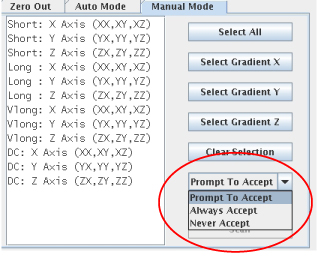 The Manual Mode tab is provided to allow individual components to be calibrated. In manual mode, all of the signal checks are performed, but since the scan has already completed, an option to abort is not presented if an error is found. In addition, unlike in Auto mode, there is not a way to turn the checking off. Due to the fact that signal from all six samples is collected and therefore all four components are available, only the selection of an entire mode is available for selection. That is, you may select the long mode pulsing the Z-axis, but not the long ZX component.