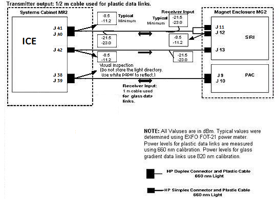 The following data characterize fiber optic power levels in a Signa system. Typical data were obtained from a limited sample of systems. Typical values may cover a wide range due to the effects of cable routing, connecting, and cable length which may vary from system to system. Minimum values, however, are absolute, and will be the same for fixed sites, mobiles, and T/R(s).