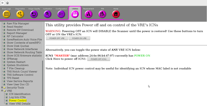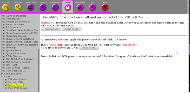 The ICNs are powered down when the host software is shut down. To shut the ICNs down individually, use the VRE Power Control utility (Power down ICNs from VRE power control)