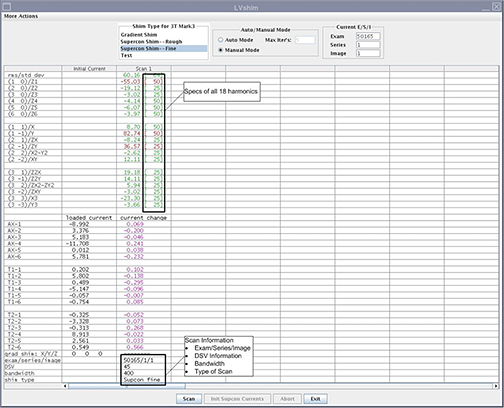The objective is to perform fine-tuning of the homogeneity of the magnet by using gradients only. The Gradshim process is performed with a sampling diameter of 22-cm DSV and the same bandwidth as Fine Shim depends on the quality (good/bad) of the fine tuning. Once the scan passes and all harmonics are in spec, the magnetic field is reanalyzed in Test mode automatically at 45DSV for customer acceptance.