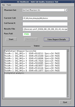 The Multi-Coil Quality Assurance (MCQA) Tool is a new tool that will simplify data acquisition and analysis of the signal-to-noise ratio (SNR) for surface coils. It will aid in detecting dead coil elements, as well as developing improved integrated signal-to-noise ratio (ISNR) specifications for all Multi-coils, independent of scanner instabilities. The tool does not rely on ROI placement as other SNR tools have in the past. Instead, it chooses slice locations based on coil geometry, acquires one Spin Echo Image, and turns off RF to gather a noise image. The noise mean of the 2D-noise-only image is subtracted from the 2D intermediate image.