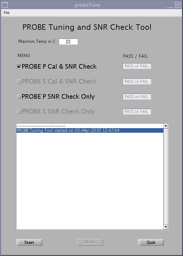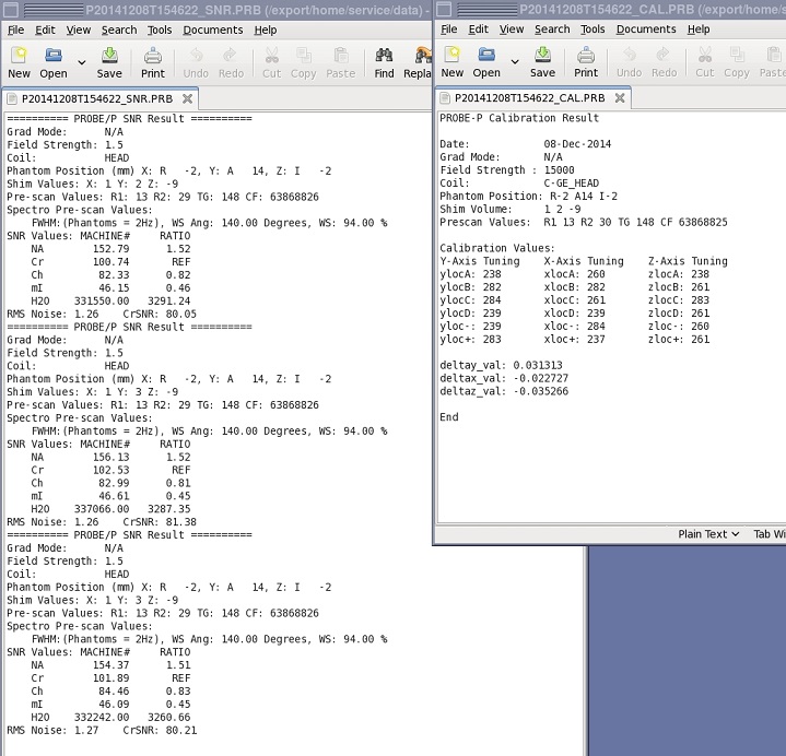 The probeTune tool also generates log files, which can be viewed from the tool or manually. There are four log files (one for each probe calibration and SNR check). The log files are stored in /usr/g/service/data and are named to indicate which test they result from (for example, *****_CAL.PRB and *****_SNR.PRB). There is no need for data sheets as in previous probe tuning applications. The files are always on the system, and saved on the SaveInfo media (if SaveInfo is performed after calibrations).