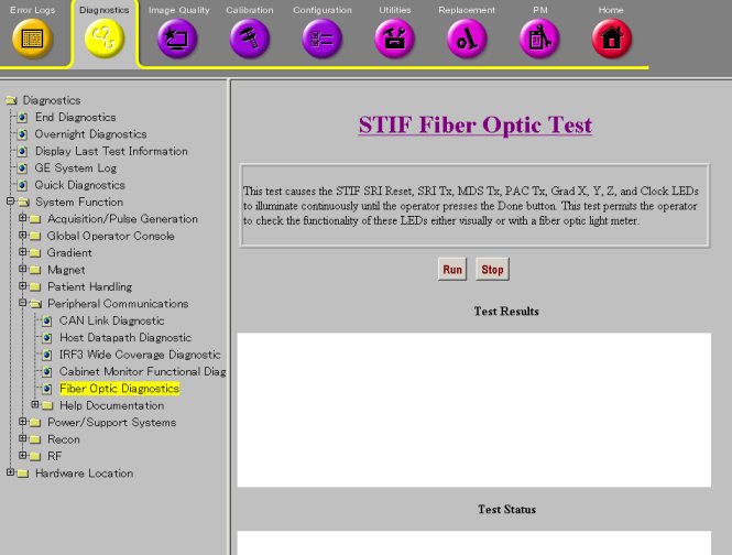 This procedure describes how to turn on the fiber optic drivers in a Signa system. Software output control is provided for the HFBR-1522 drivers (plastic cable) and the HFBR-1414 drivers (glass cable) on the STIF Board in the CAM-Lite Chassis, the HFBR-1522s (plastic cable) on the PAC and the SRI, and the HFBR-1522 drivers (plastic cable) on the MDS peripherals.