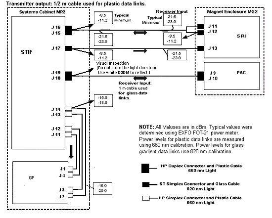 The following data characterize fiber optic power levels in a Signa system. Typical data were obtained from a limited sample of systems. Typical values may cover a wide range due to the effects of cable routing, connecting, and cable length which may vary from system to system. Minimum values, however, are absolute, and will be the same for fixed sites, mobiles, and T/R(s).