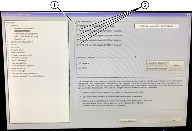 Setting the boot sequence - Dell T5820 (MR28 or later)