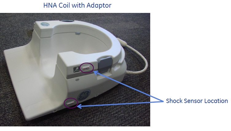 Only one shock sensor should be installed per coil, except for coils that contain two or more pieces that can be stored separately, such as the Torso Coils and Head, Neck, Spine (HNS) Coils. These coils should have a shock sensor located on each of the sections. Refer to the related coil illustration for proper placement.