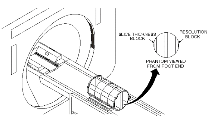 This test measures the smallest resolvable line groups in a high-contrast resolution phantom. The phantom line pair groups are oriented at a 45° angle (reference to the horizontal plane) in order to measure system resolution in the frequency and phase axes. Resolution images are acquired during the slice thickness scans, so additional scans are not required for this test.
