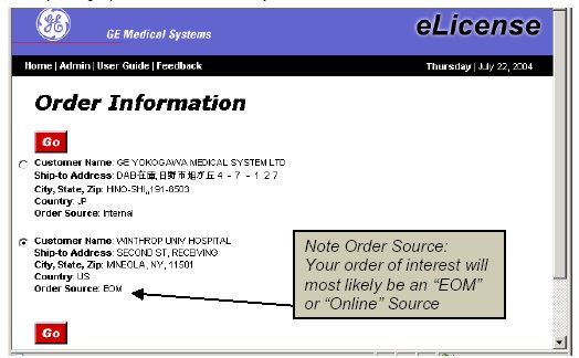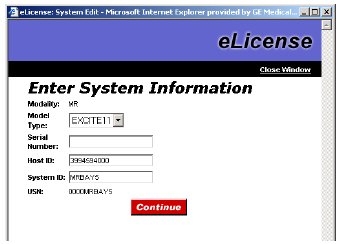 This procedure describes how to generate and install software options using eLicense. eLicense allows the field to generate license keys for MR scanners, and removes the need to send out physical media for all options on the order. The first step in creating these option keys is to visit the eLicense website, and register the scanner. In order to access the eLicense website, the user must have a computer with connectivity, as well as a single sign-on account. The eLicense website can be accessed outside of the GE intranet, at http://elicense.gehealthcare.com/elicense/. The MR system must be tied to the global order number (GON), through the host id and system id of the scanner. Once this site information has been entered, the keys can be generated, and distributed by email, downloading, saving to an eCD, or printing. This file can then be installed on the system, through inSite download eCD, or manual entry. Illustration 1-1 shows the eLicense process flow. For additional information on how to generate and obtain these keys from the eLicense server, please refer to the “eLicense User Guide” under the HELP tab of the eLicense website.