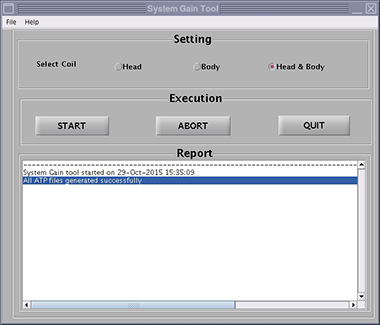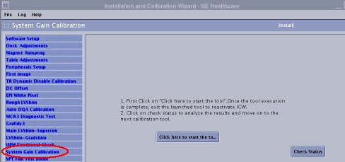 System gain calibration is performed to determine the standard head (transmit/receive coil) and body recon scale factors that will achieve a known level of image intensity when using the standard head coil or body coil with a known phantom solution and protocol. The goal is that when the same solution or tissue is scanned in either the standard head or body coil with the same protocol, those tissues will have approximately the same image intensity level on a given system and between systems of like type.