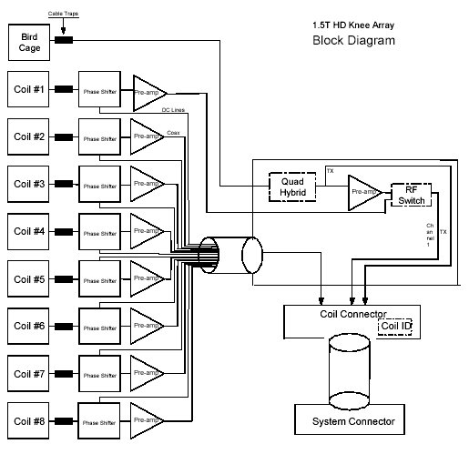 The 1.5T HD Knee Array consists of 8 receive elements, and a quad birdcage transmit coil. Each receive element is comprised of a loop arranged azimuthally around the knee. Each loop is approximately 45° in azimuthal extent. The center of Loop #1 is located 45° rotated in the clockwise direction (as viewed from the head) with respect to the center of the patella. Each of the next seven loops is rotated clockwise by 45° successively. During transmit, each receive loop is decoupled with both passive and active decoupling, with an additional active preamp protection network. During receive, the transmit bird-cage is decoupled and signals from elements 1 – 8 are directed to separate ultra-low-input impedance preamp modules placed directly at the output of the loop. These preamp modules provide additional element decoupling. In addition, the 1.5T HD Knee Array allows receiving with the bird-cage coil to obtain a uniform signal from the imaging volume.