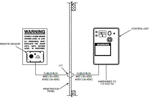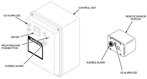 Remote Sensor Module: Includes an audio and visual alarm and an Oxygen Sensor Cell. The Remote Sensor Module is typically mounted in the Magnet Room.