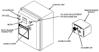 The Remote Sensor Module receives power from the Control Unit to operate the alarm horn and LED. The Oxygen Sensor Cell produces the voltage indicating the oxygen level.